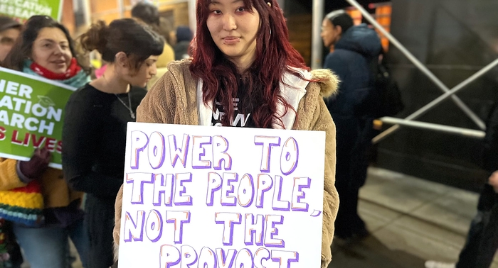 Стотици се събраха на протест пред Нова школа в Манхатън, за да изразят недоволството си от планираните съкращения на преподаватели и програми. Събитието се проведе по време на зас ...