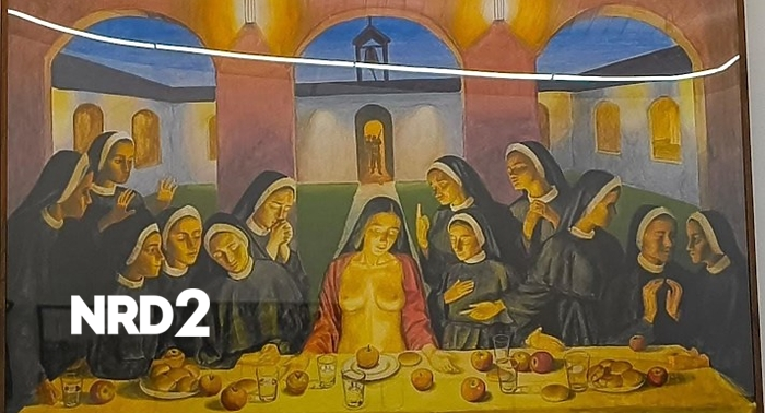 Том Ваттакузи оттегля картината "Вечеря в манастир" след религиозни протестиКартината изобразява голата Матa Хари, холандската танцьорка, екзекутирана като германски шпионин от французите по време на Първата световна война, в ролята на Исус, заобиколена от монахини, играещи ролята на учениците. Фондацията на Kochi Biennale затвори изложбата за няколко дни миналата седмица в отговор на протестите. След оттеглянето на картината, мястото на EDAM отново отвори врати за посетители.